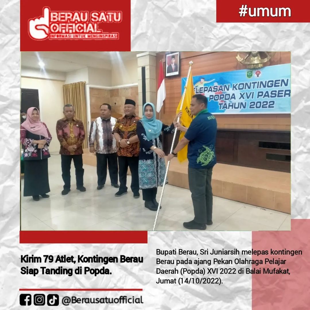 Bupati Berau, Sri Juniarsih melepas kontingen Berau pada ajang Pekan Olahraga Pelajar Daerah (Popda) XVI 2022 di Balai Mufakat, Jumat (14/10/2022).